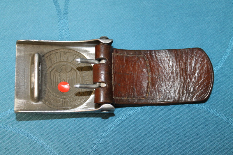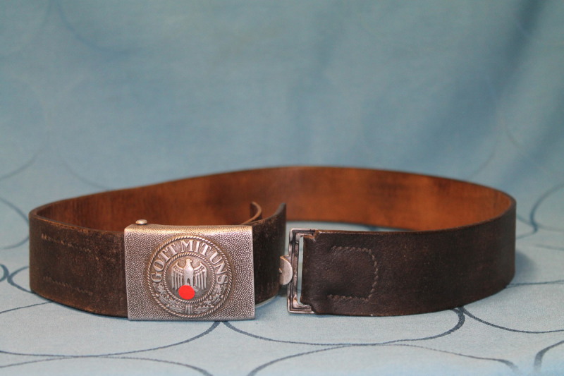 Koppel der Wehrmacht, Schloss Aluminium mit Resten der feldgrauen Lackierung, unter dem Steg Herstellermarke GB, Lederzunge mit Hersteller G. Brehmer Marktneukirchen 1938. Ungekürzter Riemen mit Längenangabe 95 (cm), Gegenhaken Aluminium.