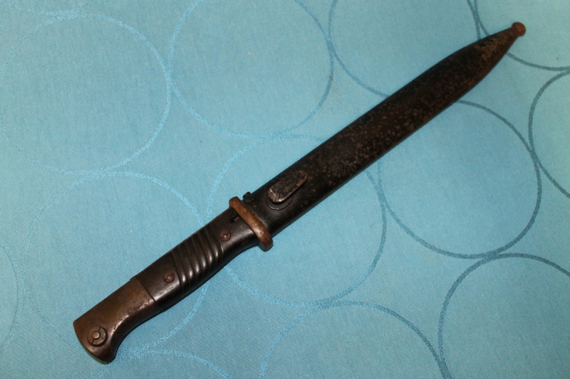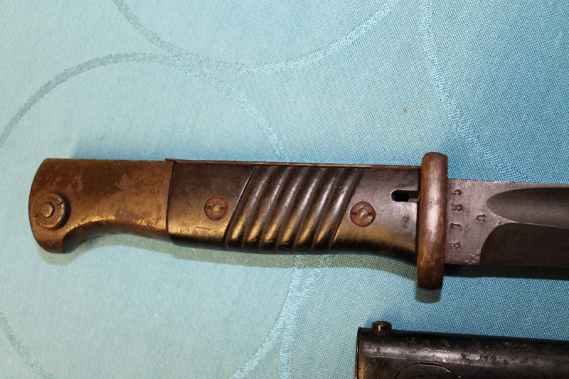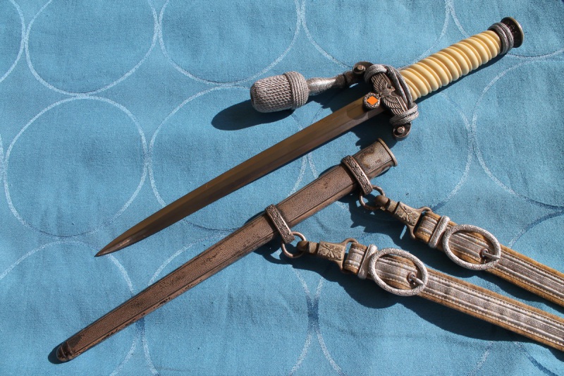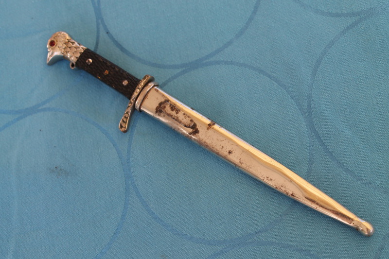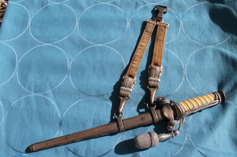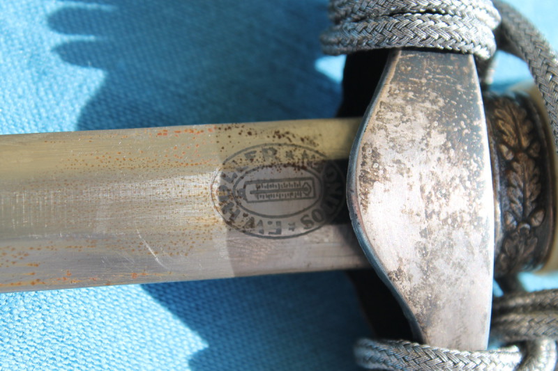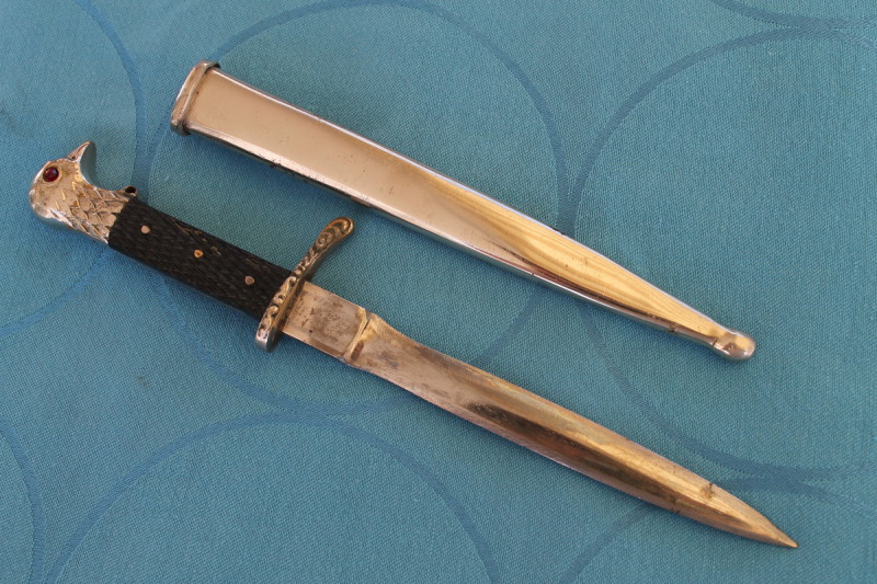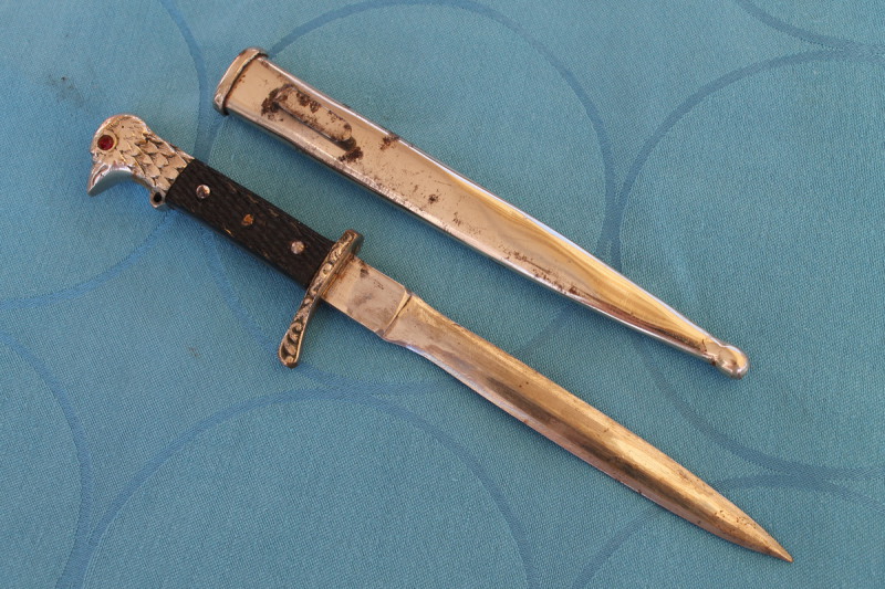 Guter, ungereinigter Zustand wie gefunden, Klinge mit Schleifspuren, Spitze etwas rund, Devise etwas verputzt, Klinge wackelt etwas. Email der Raute bis auf einen winzigen Chip unbeschädigt. Griffschalen unbeschädigt und original vernietet. Belederung der Scheide alt gewechselt, Scheide möglicherweise mal in alter Zeit überlackiert.