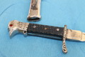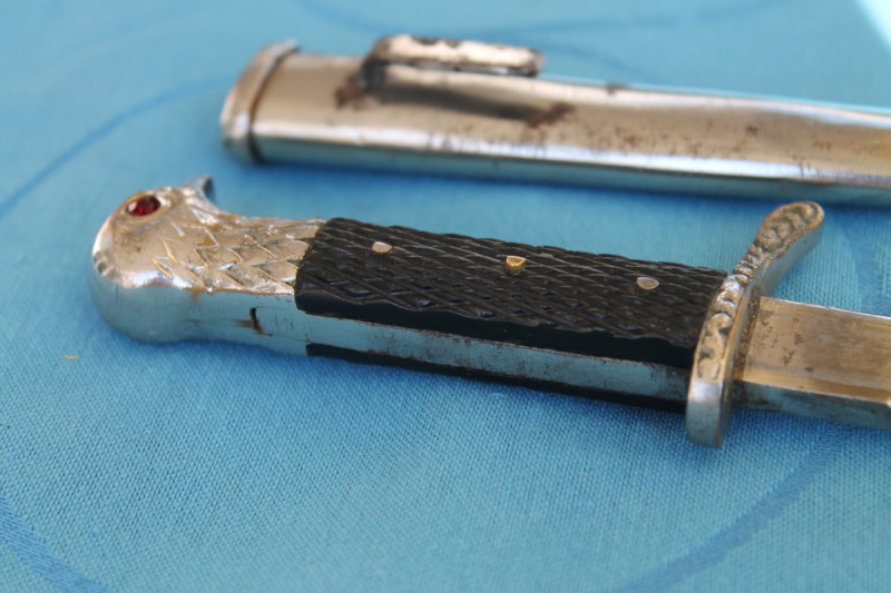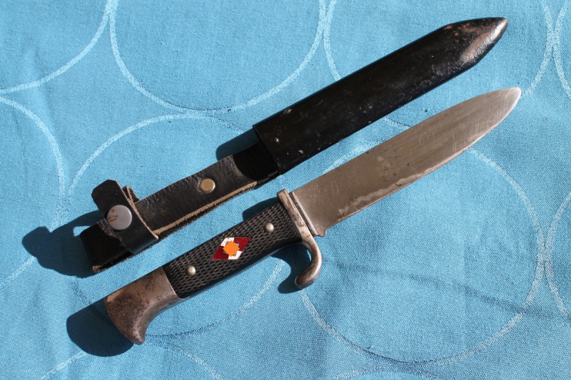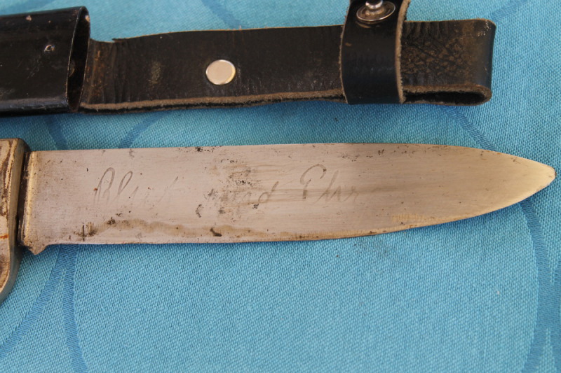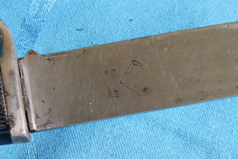 HJ Fahrtenmesser der Firma Puma in Solingen. Frühes, schweres Stück mit vernickeltem Eisengriff. Griffschalen Kunststoff mit original eingelegter Raute. Klinge mit geätzter Devise, auf der anderen Seite großes Puma Logo. Scheide Stahl schwarz lackiert.
